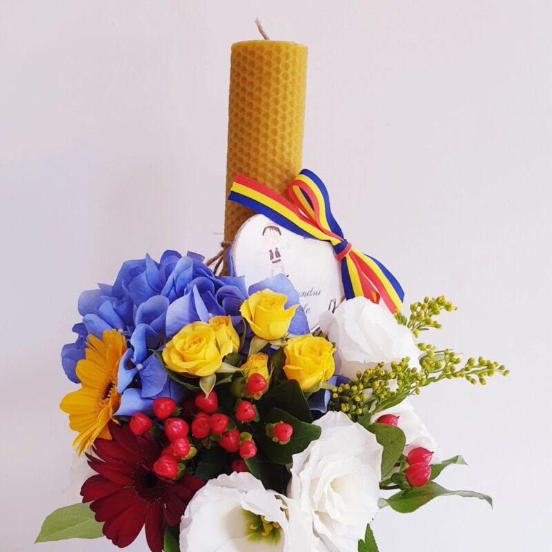210,00 leiLumanare decorata cu aranjament floral realizat pe o parte, alcătuit din trandafir criogenat, flori de bumbac, lagurus,frunze de voal ,gheme colorate si materiale pentru sustinere.…
